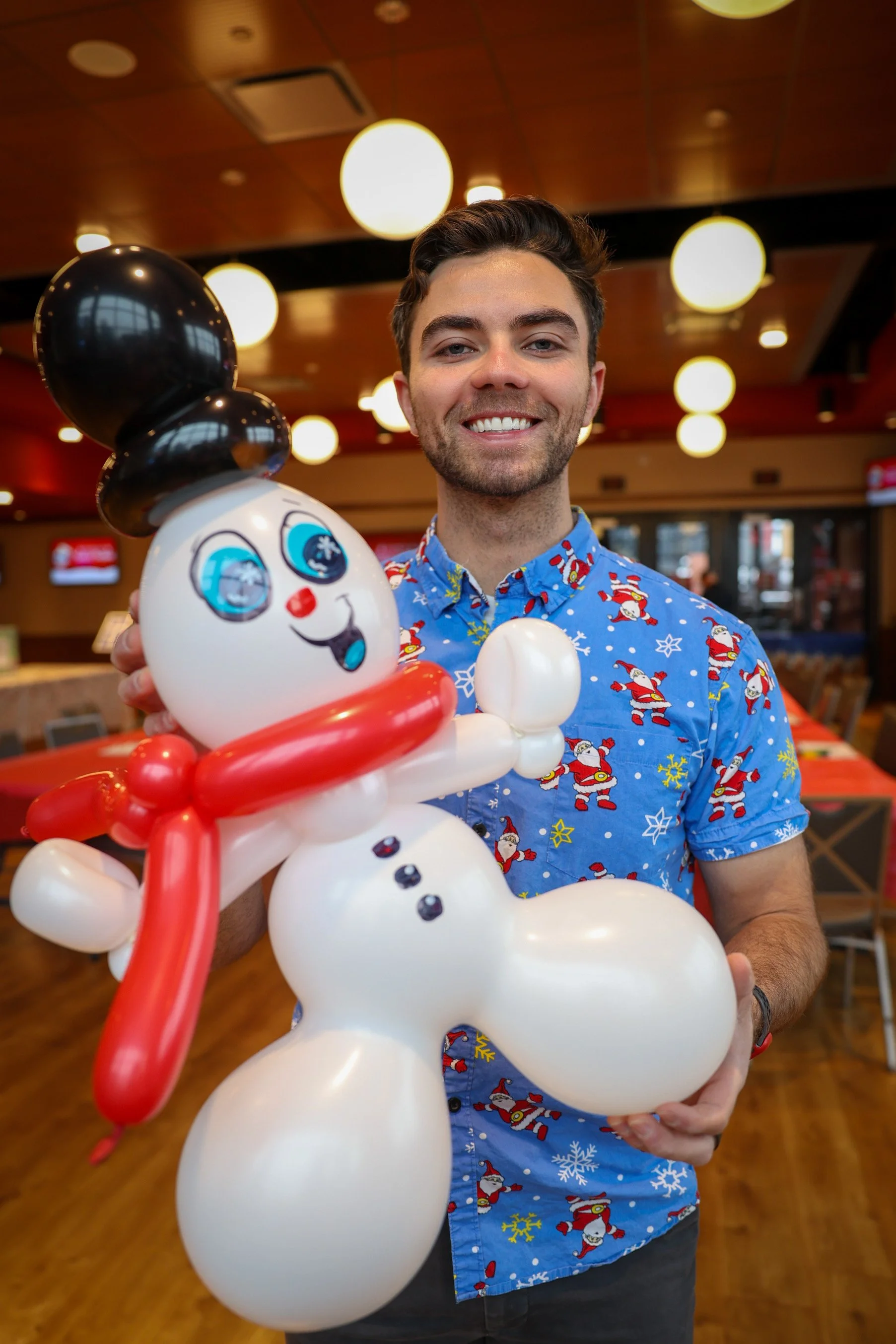 A high-energy balloon show starring Tyler the Balloon Guy that turns your guest of honor into the star of the celebration. The experience begins with a lively entrance and quick introductions before the spotlight shifts to the birthday kid, graduate, or celebrated guest to help create a one-of-a-kind balloon sculpture live during the show.